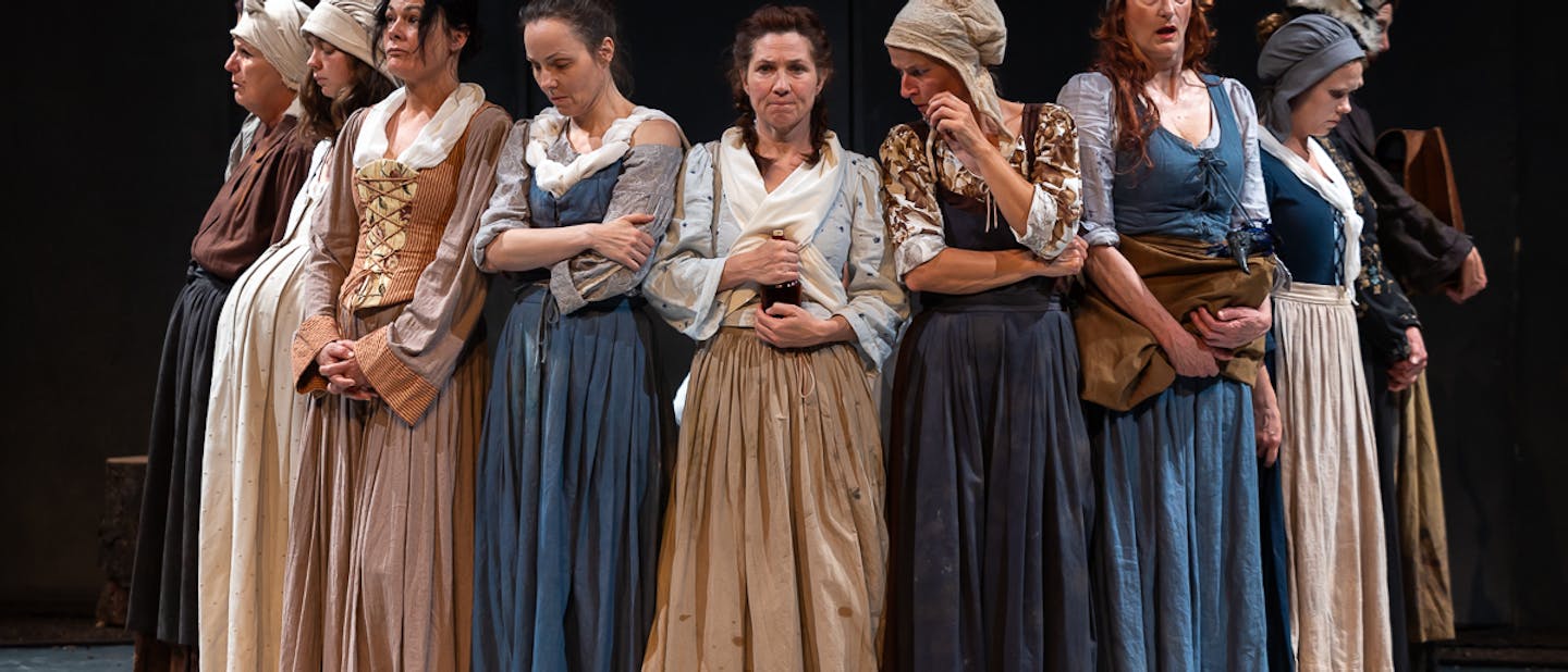 Uprizoritev s scenografsko odločitvijo (scenograf Igor Vasiljev), da oder oblikuje v krožni obliki z luknjo na sredini in ga hkrati postavi nekoliko naprej, da sega že v dvorano (čeprav je to morda samo prilagoditev za tokratno gostovanje), doseže občutek, da je dogajanje v sodni dvorani nevarno blizu. Hkrati je prvi prizor, pri katerem v poltemi spremljamo dogajanje v gozdu, prav zaradi podaljšanega odra toliko bolj oddaljen, po drugi strani tudi toliko bolj nerealen. Čeprav z gozdom po navadi povezujemo mirnejše občutke, je glasba (skladatelj Drago Ivanuša), ki spremlja prvi prizor, sicer dolg dobrih dvajset minut, vedno intenzivnejša, zdi se, da nakazuje neko nevarnost, morda tudi katastrofo. Kontrast, ki se pri tem vzpostavi, je več kot učinkovit, ko na oder prihajajo igralke in igralci, da »počistijo« veje in zemljo, s tem pa pripravijo oder za nadaljnje dogajanje, je čustvena nabitost le še močnejša. Ko že mislimo, da napetost doseže vrhunec in bo zares nastopila katastrofa (čeprav: ali ni katastrofa že tukaj od samega začetka?), se z nenadno spremembo luči dogajanje prekine in nekje drugje znova začne. Istočasno spremljamo, kako v sodno dvorano prihajajo posamezne ženske, članice porote mater, in Elizabeth, ki jo gospod Coombes (Igor Samobor) še prepričuje, da bi se jim pridružila. Nasploh je delitev na dogajanje na levi in desni strani dobra rešitev, ki kasneje pri odločanju, ali je Sally noseča ali ne, tudi jasno vzpostavlja, kdo je za in kdo proti. Ločnica je nevidna in hkrati vidna, bolj kot je dogajanje napeto, bolj se briše, zdi se, da je takrat na odru tudi več krožnega gibanja. Množični prizori (večino časa je namreč na odru vseh 14 igralk) kažejo na natančno izdelano »koreografijo« predstave, hkrati tudi na temeljit premislek o organiziranju kaosa, ki mora delovati kot kaos, da lahko do izraza še jasneje in še bolje pridejo ključni poudarki v besedilu (dramaturg Milan Ramšak Marković).